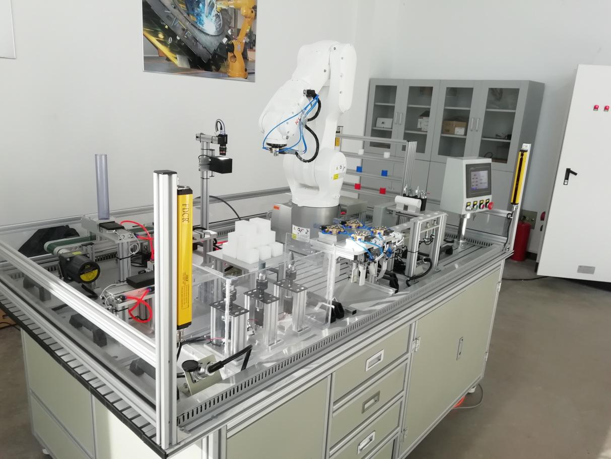 2 、碼垛:碼垛是模擬工業(yè)場(chǎng)合的自動(dòng)搬運(yùn)碼垛功能設(shè)計(jì),可以自動(dòng)記錄碼垛位置和高度,具有重復(fù)精度高,自動(dòng)計(jì)算旋轉(zhuǎn)角度等功能;工業(yè)機(jī)器人工具盤上安裝了氣動(dòng)吸盤;包含一個(gè)輸送帶,采用步進(jìn)電機(jī)驅(qū)動(dòng);電機(jī)速度可以進(jìn)行調(diào)節(jié);可以實(shí)現(xiàn)將模擬物料送到輸送帶上進(jìn)行定向傳送;具有傳感器能夠檢測(cè)模擬物料是否到達(dá)指定位置。