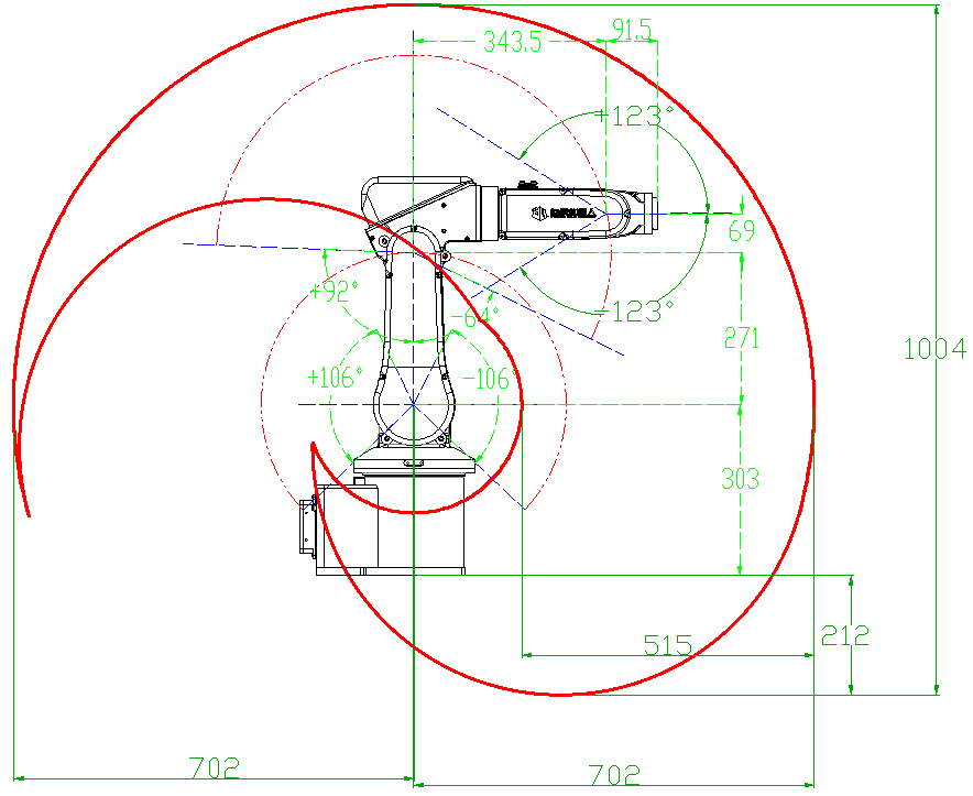 軸數(shù) :6 有效載荷 :4Kg 重復(fù)定位精度:± 0.05mm 安裝方式:任意角度 本體重量 :27Kg 最大運動半徑 :702mm 能耗: 1.2KW 運動范圍: J1 回轉(zhuǎn): +152 °—— -152 ° J2 回轉(zhuǎn): +106 °—— -106 ° J3 回轉(zhuǎn): +64 °—— -92 ° J4 回轉(zhuǎn): +135 °—— -135 ° J5 回轉(zhuǎn): +152 °—— -152 ° J6 回轉(zhuǎn): +400 °—— -400 ° 電源電壓: AC 220V 50/60HZ |