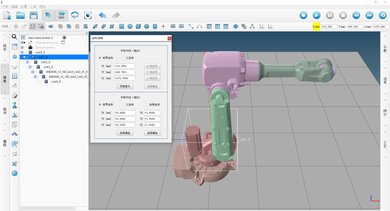 9 )支持多機(jī)器人同步運動仿真,能夠?qū)崿F(xiàn) 5 個及以上機(jī)器人與外部軸的同步運動