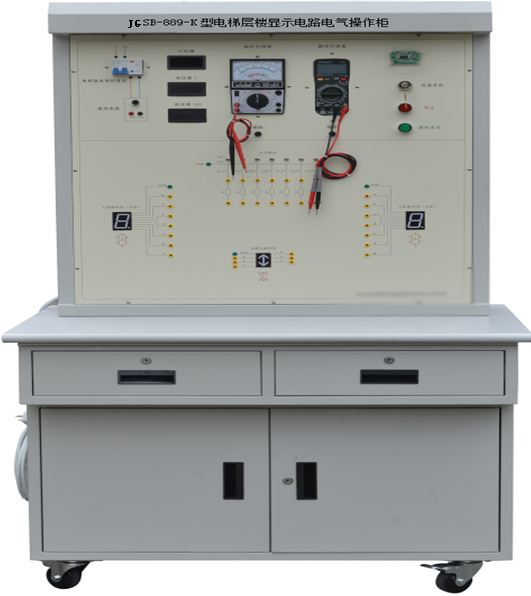 JG-889-K 型電梯層樓顯示電路電氣操作柜由實(shí)訓(xùn)桌和實(shí)訓(xùn)臺(tái)兩部份組成。