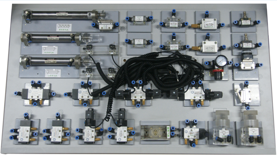 本實驗臺設(shè)計有專用的原件配置板,每個元件都有一個固定的放置位置。有利于實驗器件的管理。配備了:空氣過濾、減壓、油霧器三聯(lián)件,減壓閥,手動換向閥,電磁換向閥,氣控換向閥,行程閥,單向閥,節(jié)流閥、單向節(jié)流閥、快速排氣閥,或門型梭閥,單作用氣缸,雙作用氣缸、旋轉(zhuǎn)氣缸.....等常用的氣動元件。(具體配置詳見清單)