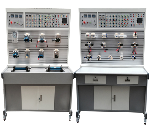 液壓與氣壓傳動PLC控制綜合實訓(xùn)裝置采用“二合一”結(jié)構(gòu),配備兩套實驗設(shè)備,一套為氣動與PLC實訓(xùn)平臺,另一套為液壓傳動與PLC實訓(xùn)平臺,且各自配有獨立的PLC電氣控制設(shè)備。