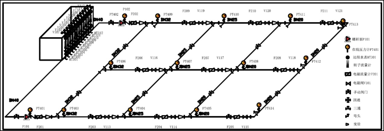 采用調(diào)速水泵供水,利用回水管收集各節(jié)點的出水,回流進入循環(huán)水箱。在管網(wǎng)的另一端再加設(shè)一臺調(diào)速水泵,模擬多水源管網(wǎng)供水,同時也可作為備用泵。