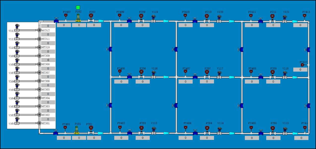 市政給水管網(wǎng)中的水流狀態(tài),是一個隨供水壓力和實際用水量變化而時時改變的復雜狀態(tài)。室外給水管網(wǎng)仿真實驗通過對水泵工作頻率的改變來實現(xiàn)水泵工作揚程的改變,從而模擬市政給水管網(wǎng)供水壓力的變化;通過調(diào)整用水節(jié)點閥門的開啟來實現(xiàn)管網(wǎng)中用水量的變化,從而來觀察由于供水壓力、水量和節(jié)點出流的改變而引起的管網(wǎng)工作狀態(tài)的變化和觀察室外給水管道系統(tǒng)的管中流量、節(jié)點壓力變化、管道水頭損失等過程。