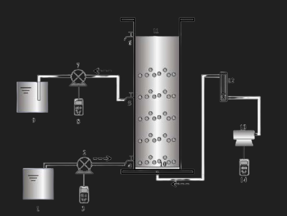 1. 進(jìn)水桶 2. 進(jìn)水泵 3. 進(jìn)水泵開關(guān) 4. 進(jìn)水閥 5. 出水閥 6. 取樣閥 7. 出水泵 8. 出水泵開關(guān) 9. 出水桶 10. 微孔曝氣盤 11. 反應(yīng)器 12. 轉(zhuǎn)子流量計 13. 蠕動泵 14. 蠕動泵開關(guān)