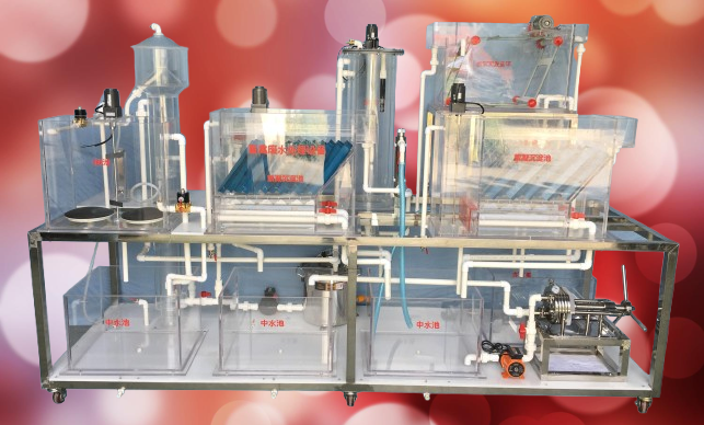 觸摸屏控制、也可以手動(dòng)、在線監(jiān)測(cè)儀( PH 儀和 DO 儀),監(jiān)控等組成,供水系統(tǒng):主要由水箱、不銹鋼支架、水箱液位管和球鬧等組成。污水處理系統(tǒng):裝置對(duì)象設(shè)備整體采用不銹鋼框架進(jìn)行設(shè)計(jì),主要?jiǎng)恿ο到y(tǒng)器件安裝在鋼架上,主要有機(jī)玻璃反應(yīng)器合理的布置安裝在不銹鋼鋼架的上層。下層動(dòng)力系統(tǒng)主要由水泵、風(fēng)機(jī)、中水池裝置等組成。有機(jī)玻璃反應(yīng)器系統(tǒng)主要由有機(jī)玻璃平流式沉淀池、 CSTR 池、輻流式沉淀池、 UASB 池、 SBR 池、絮凝沉淀池、消毒池、固液分離機(jī)、有機(jī)玻璃中和池等組成。曝氣系統(tǒng)主要由風(fēng)機(jī)、曝氣管、攪拌機(jī)、流量計(jì)和管道等組成,在線監(jiān)測(cè)系統(tǒng)主要由 DO 在線儀、 PH 在線儀、浮球液位開關(guān)等組成。