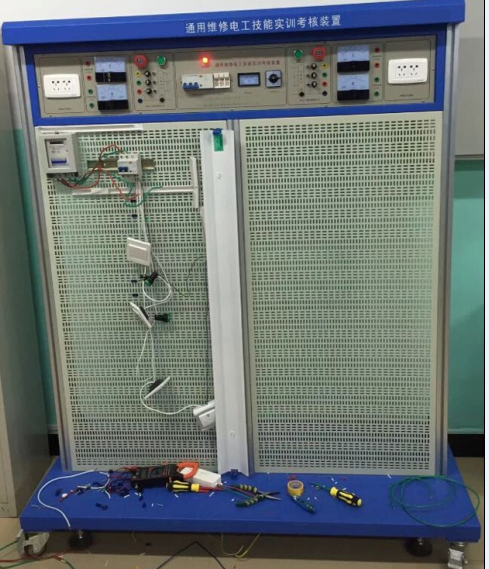 通用維修電工技能實(shí)訓(xùn)考核裝置主要由鋁合金實(shí)訓(xùn)臺(tái)架和網(wǎng)孔板組成。學(xué)生通過(guò)實(shí)訓(xùn)線路進(jìn)行元器件的布局安裝,接線全部由學(xué)生自行完成,有利于培養(yǎng)學(xué)生的動(dòng)手能力和操作技能。實(shí)訓(xùn)項(xiàng)目可自行確定,根據(jù)所選的項(xiàng)目選擇相應(yīng)的元器件,也可作為電工考證的考核理想設(shè)備。