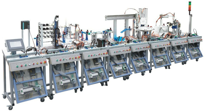 網(wǎng)絡型模塊式柔性自動化生產(chǎn)線實訓系統(tǒng)是一種典型的柔性自動生產(chǎn)線,由 9 個單元組成,分別為上料檢測單元、操作手單元、加工單元、提取單元、傳送帶單元、搬運單元、安裝單元、分類倉儲單元和總控平臺組成。每站均配有獨立的 PLC 。上述機構(gòu)均安裝在工業(yè)型材桌面上,系統(tǒng)中的機械結(jié)構(gòu)、電氣控制回路、執(zhí)行機構(gòu)完全獨立,主要結(jié)構(gòu)件全部采用鋁質(zhì)材料加工而成,美觀大方,學生可自行組裝,接線,編程及調(diào)試。